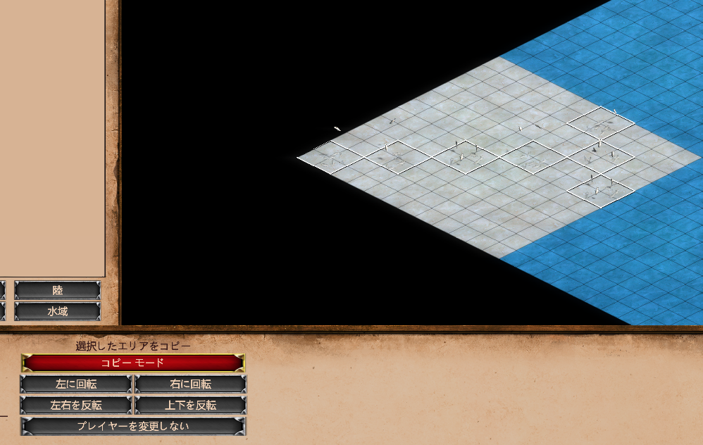 あとはこれをスタンプみたいにコピーして斜めに並べていく。「地形」タブを開き、「ブラシの種類」を「マップのコピー」とし、すべての魚が引っかかるように選択を行い、「コピー モード」を選択する。